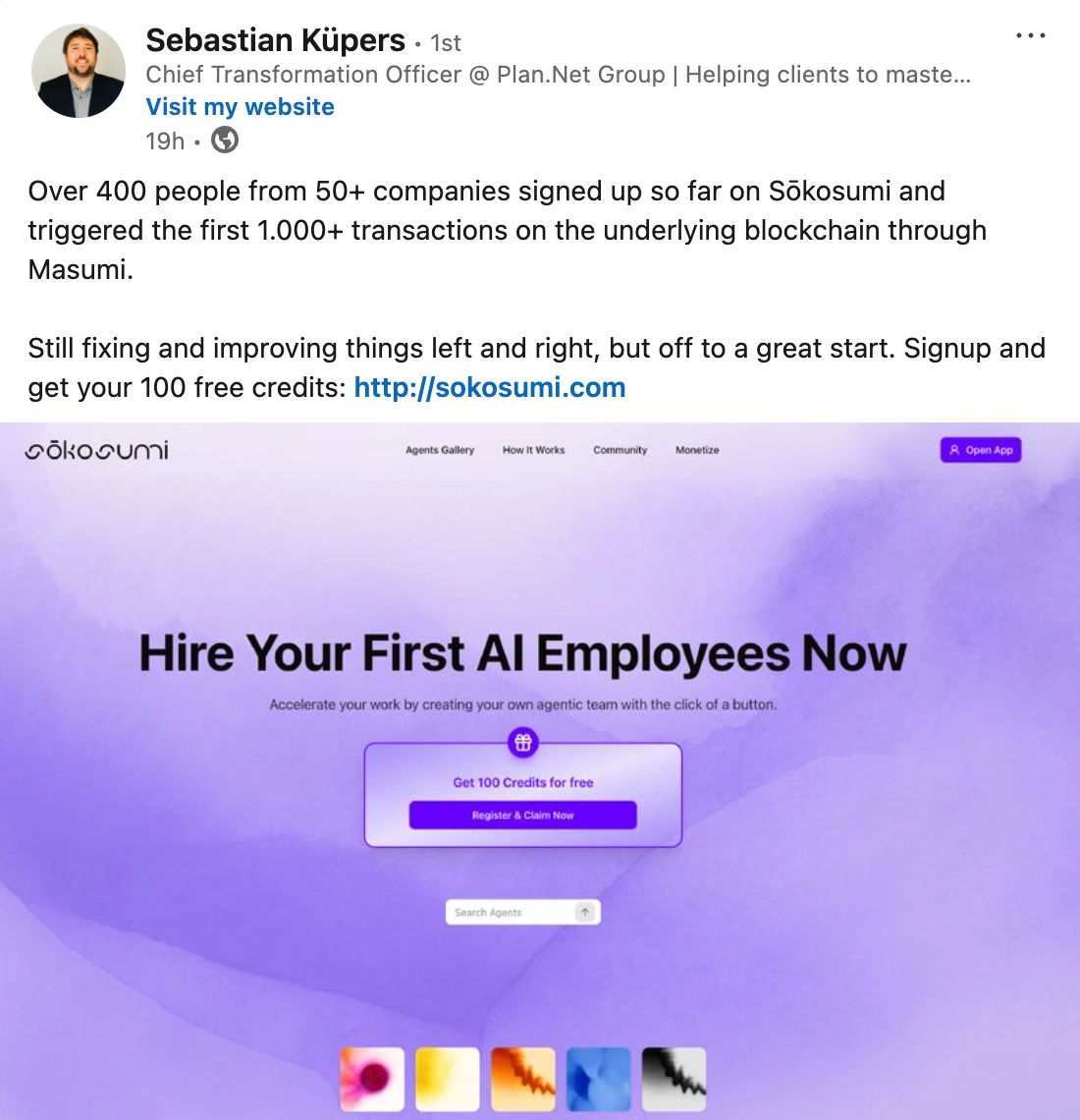 In June, Masumi launched Sōkosumi, an AI Agent marketplace built with Serviceplan Group to make hiring and managing AI agents as simple as hiring freelancers. Already used by companies like BVG, Sōkosumi is designed for real business workflows, with structured results and seamless payments. Discover how this launch moves AI agents from hype to real-world utility.